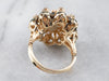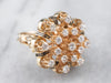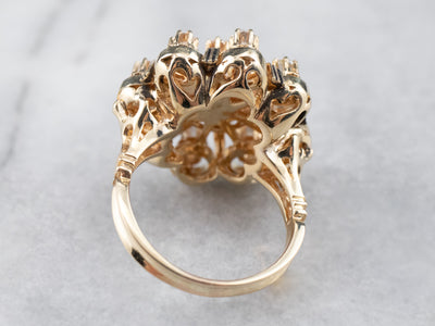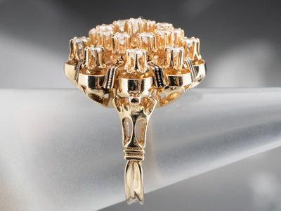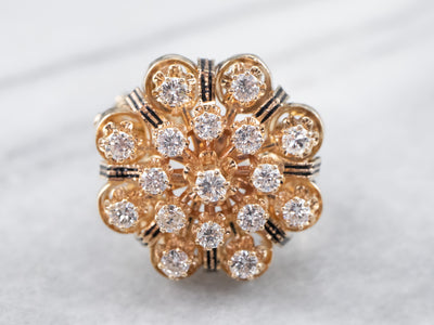 Absolutely stunning! This vintage, Mid-Century cocktail ring features a gleaming array of diamonds orbiting around an open work black enamel gold center. This is a wonderful combination of sexy and yet sophisticated, easy to transfer from office to evening. Perfectly proportioned and very well balanced, this vintage cluster ring is a bold, but comfortable piece!